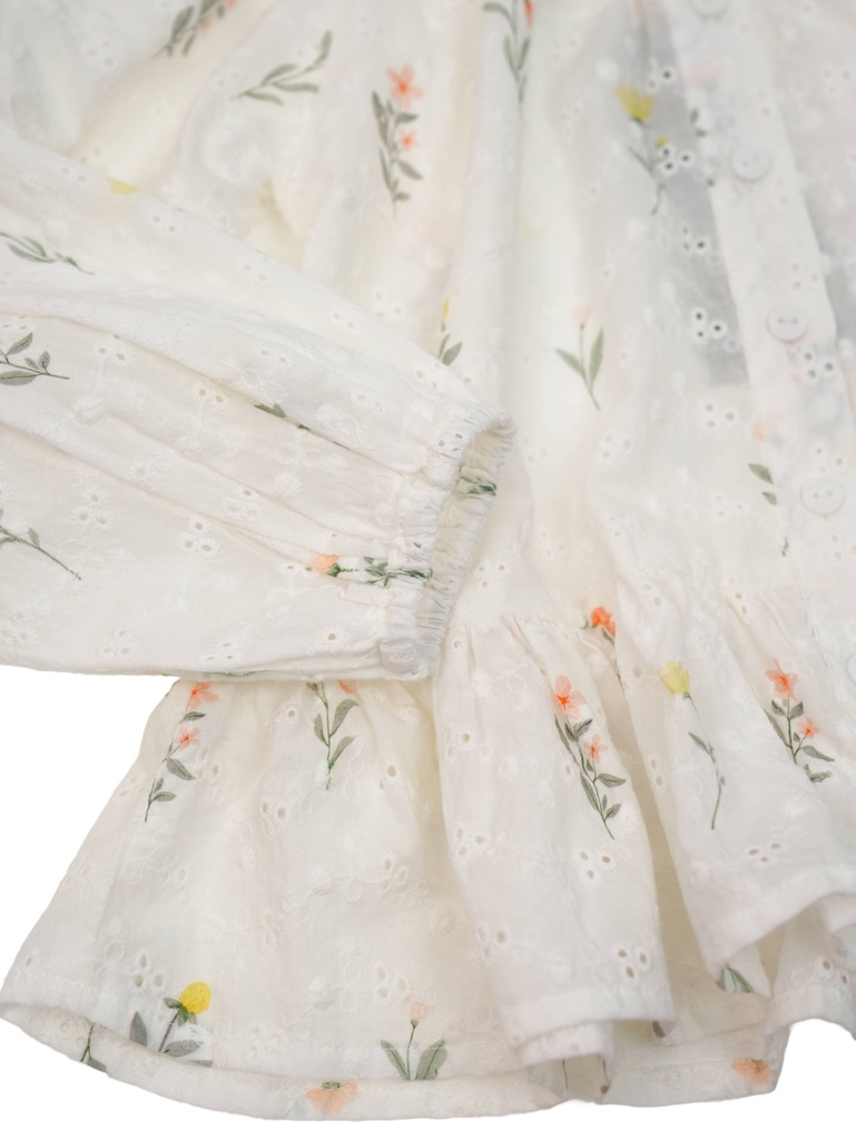 Cet ensemble fille incarne une élégance douce et naturelle, il se compose d’un haut blanc à manches longues, subtilement orné de petits motifs floraux délicats, et d’un pantalon assorti, dans une teinte rose poudré douce. Sa coupe légèrement évasée et ses finitions froncées offrent une silhouette fluide et confortable.