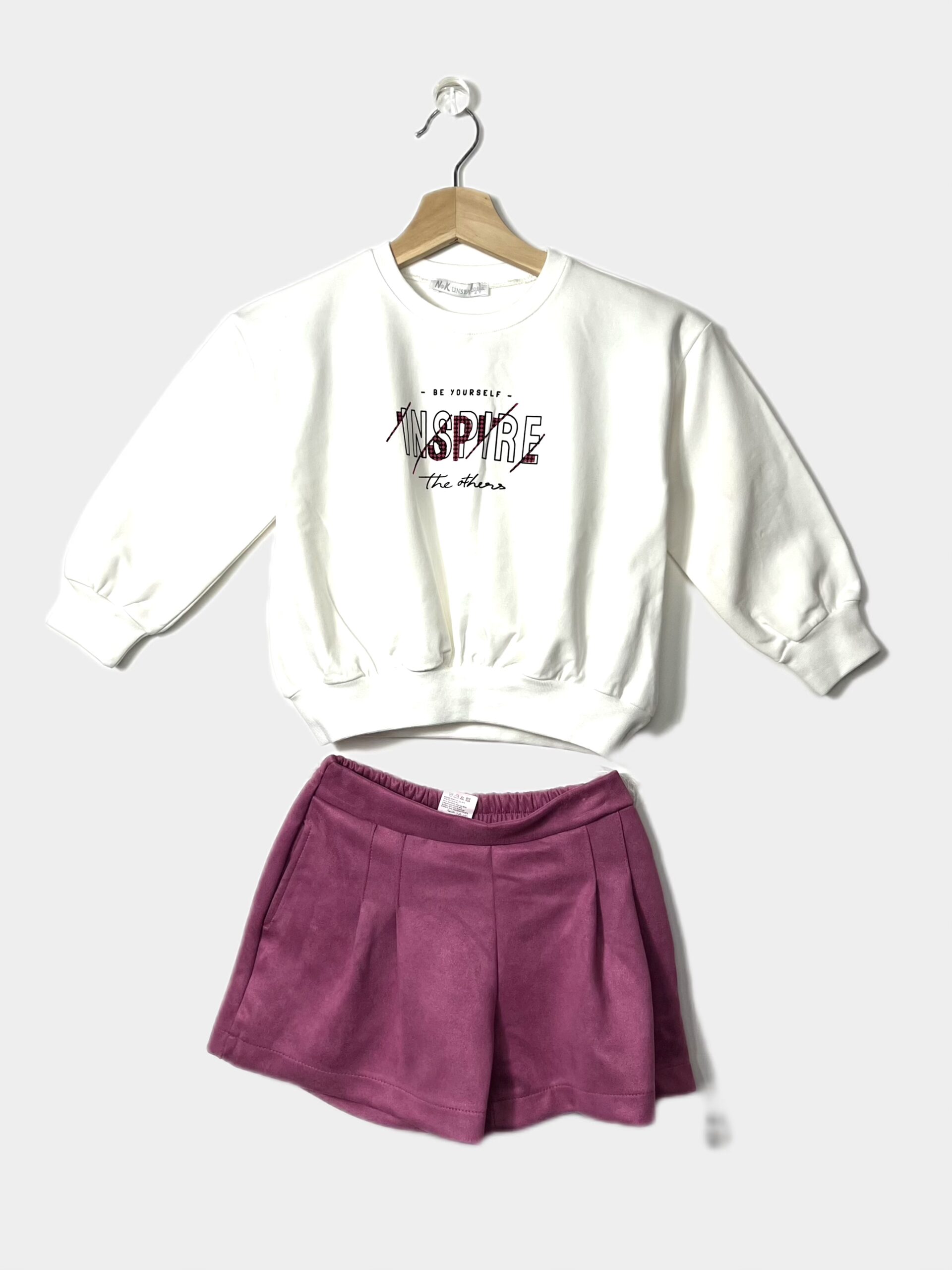 Ensemble enfant fille de 02 pièces, pull blanc 100% coton et un short violet en velours doux.