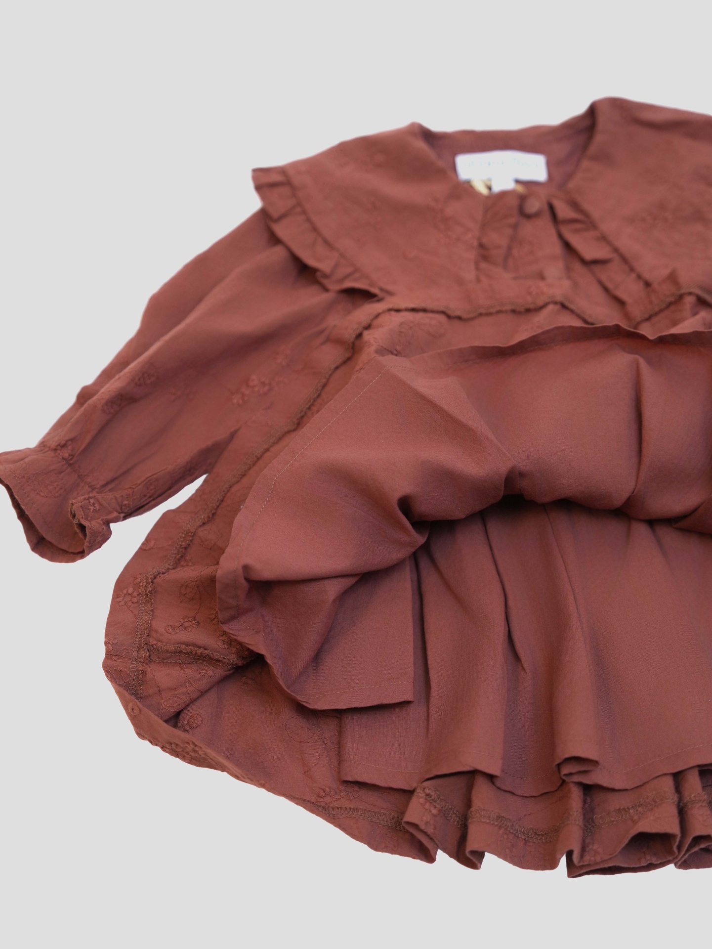 Craquez pour cette ravissante robe bébé, une pièce pleine de charme qui allie délicatesse, confort et style intemporel, pensée pour sublimer les plus jolis moments. Elle se distingue par sa teinte terracotta chaleureuse, subtilement rehaussée de motifs brodés ton sur ton. Col large volanté, manches longues, et coupe évasée pour plus de liberté de mouvement.