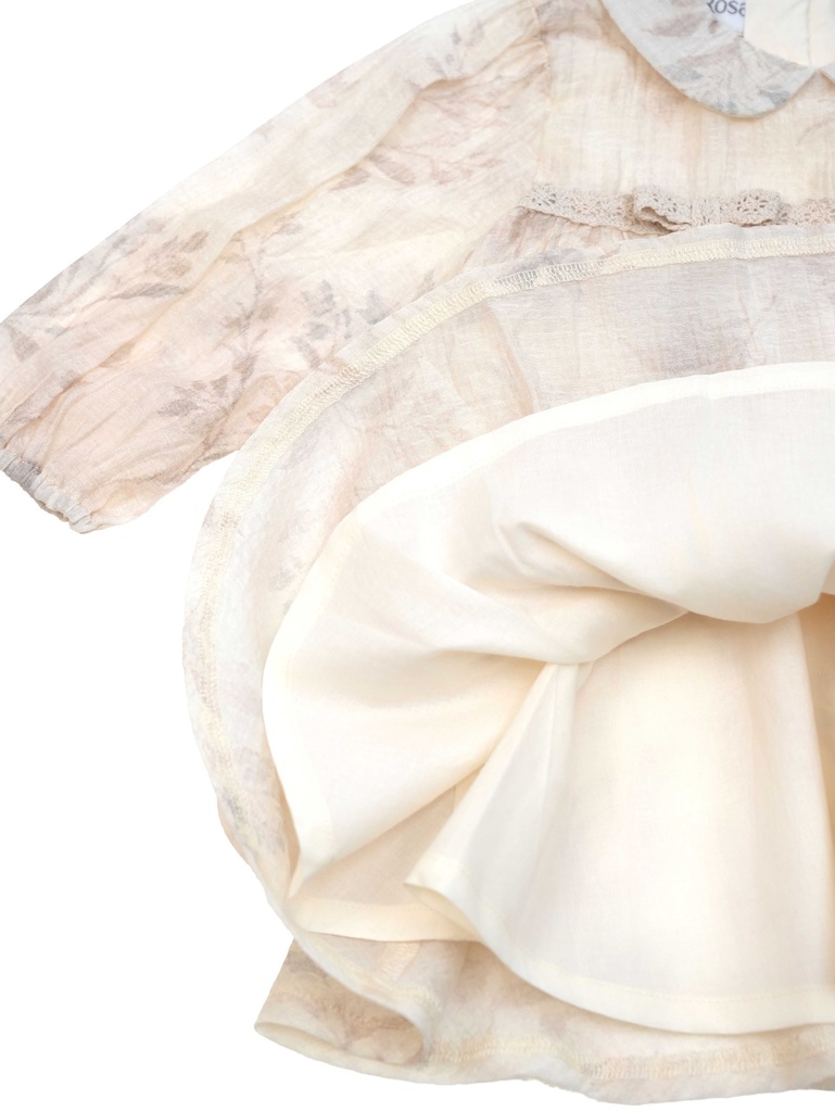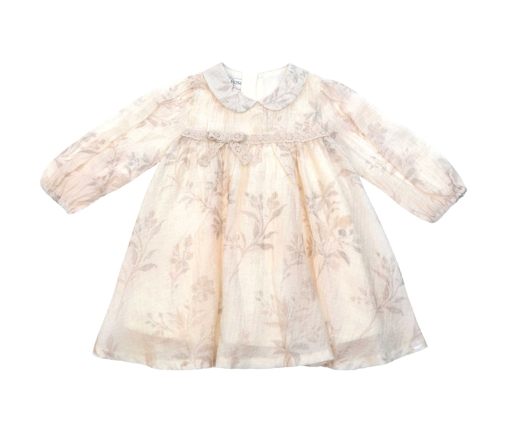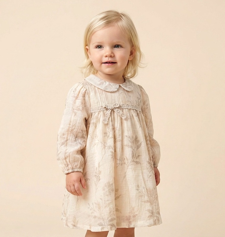Robe bébé fille séduit par sa teinte ivoire lumineuse, délicatement ornée de motifs floraux, à la coupe fluide et élégante. Ses manches longues et son tombé vaporeux en font la tenue idéale pour célébrer le moments précieux avec douceur et raffinement.