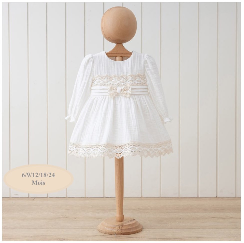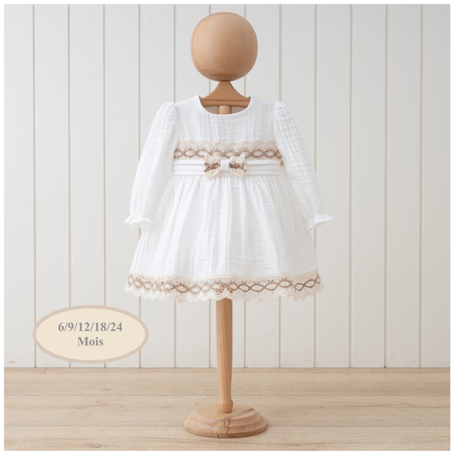 Robe bébé fille blanche à manches longues avec un papillon mignon tissu 100% gaze de coton