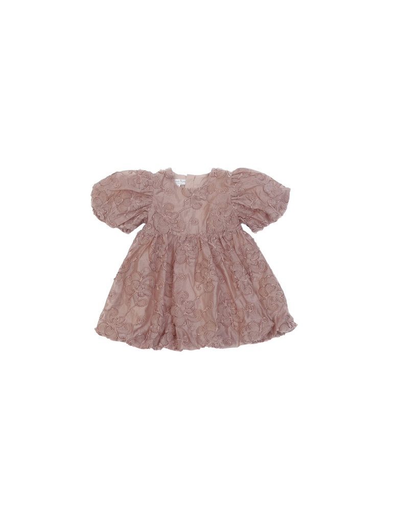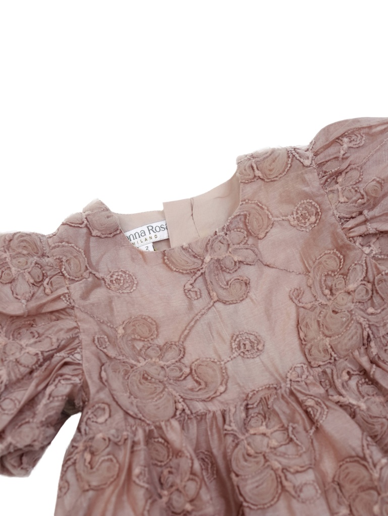 Laissez vous séduire par cette élégante robe fille en nude rosé, sublimée par de délicats motifs floraux en relief. Sa coupe ample et ses manches bouffantes offrent confort et raffinement pour célébrer les moments precieux avec douceur et élégance.