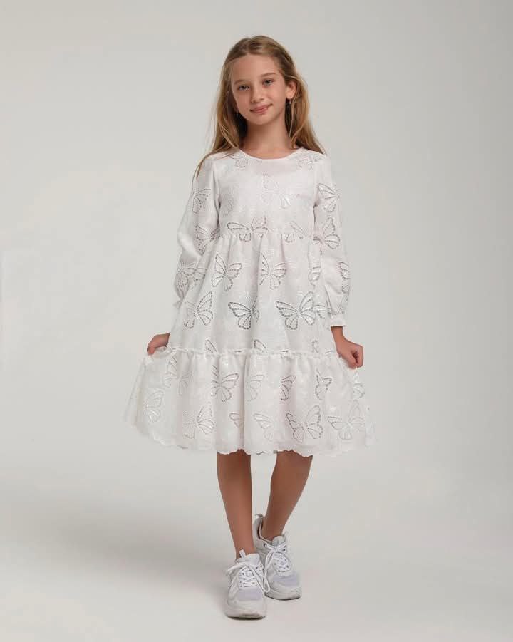 Craquez pour cette robe fille blanche aux motifs petits papillons brodés, idéale pour les fêtes, occasions spéciales comme pour le quotidien.