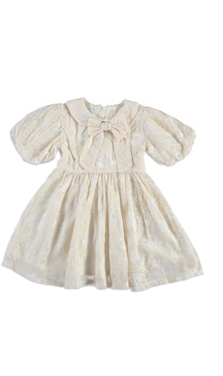 Cette robe se distingue par sa teinte écru doux, élégante et raffinée. Son col orné d’un nœud délicat apporte une touche de charme rétro. Les manches demi-manches légèrement bouffantes et les finitions soignées témoignent d’un savoir-faire délicat, idéal pour une allure distinguée et moderne. Parfaite pour : cérémonies, fêtes, occasions spéciales ou looks élégants du quotidien.