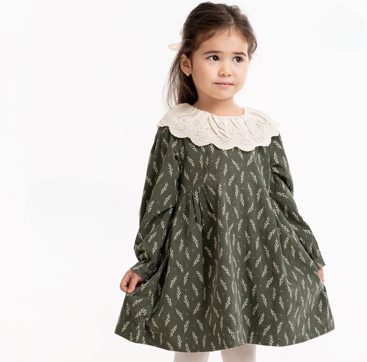 Craquez pour cette adorable robe au style intemporel, confectionnée dans un tissu doux et confortable. Son imprimé délicat, associé à un col en dentelle brodée, apporte une touche raffinée et vintage. Les manches longues légèrement bouffantes et la coupe fluide offrent une allure élégante tout en garantissant un confort optimal pour les enfants.
